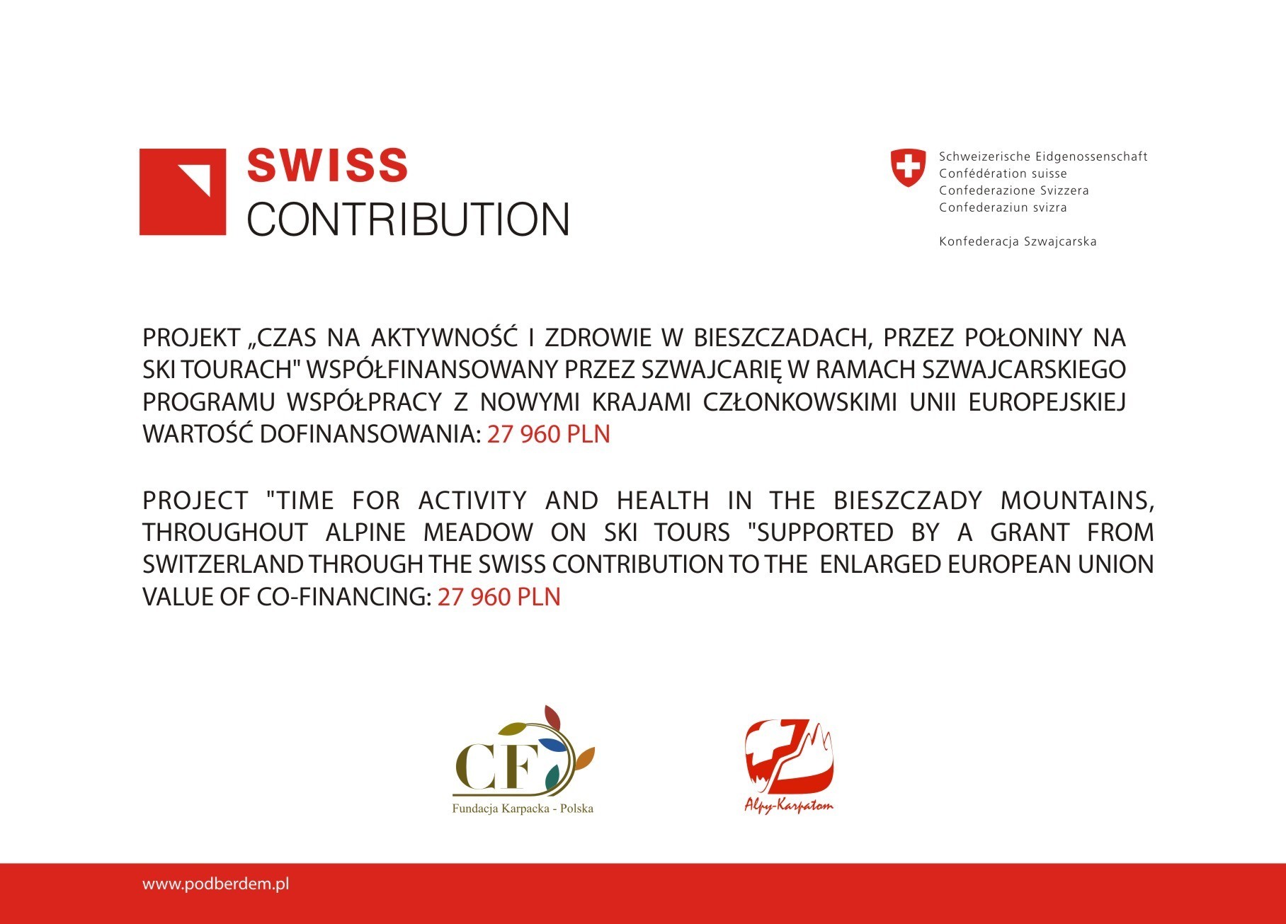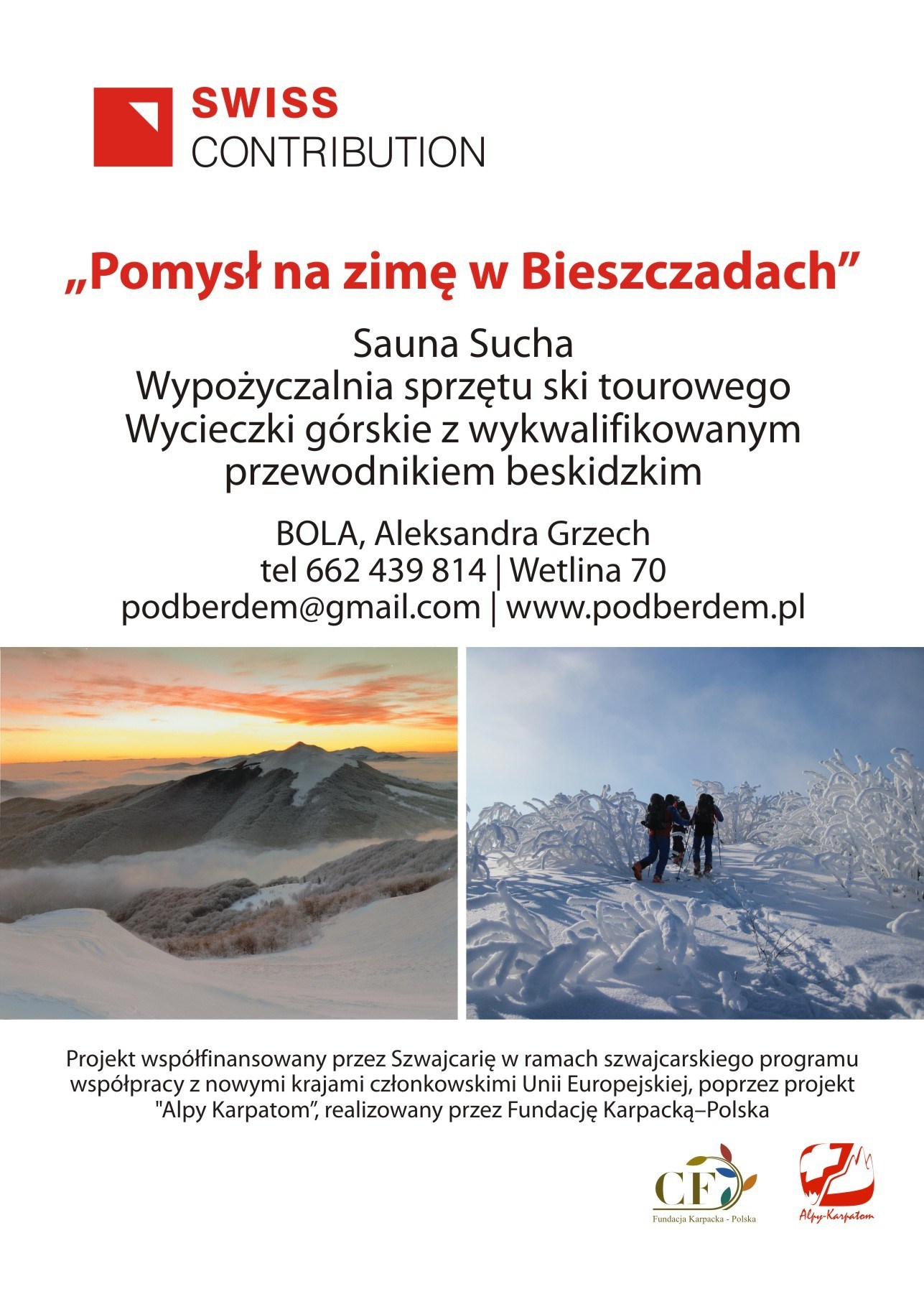 PROJECT “TIME FOR ACTIVITY AND HEALTH IN THE BIESZCZADY MOUNTAINS, THROUGHOUT ALPINE MEADOW ON SKI TOURS” SUPPORTED BY A GRANT FROM SWITZERLAND THROUGH THE SWISS CONTRIBUTION TO THE ENLARGED EUROPEAN UNION VALUE OF CO-FINANCING: 27 960 PLN
